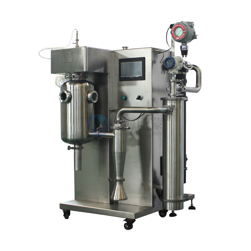 首先在開啟風機,加熱模塊,噴霧干燥機體內充入氮氣,要被干燥的液態物料經輸液泵輸送至噴頭處,液態物料被霧化器霧化成細小液滴,液滴在干燥塔內與熱氮氣進行充分的熱交換,物料中的液態部分被瞬間蒸發,固態部分形成的粉狀物料沉于塔底,*后經過旋風分離器進行氣固分離至物料收集瓶,溶劑經過冷凝器回收,氣體循環利用。