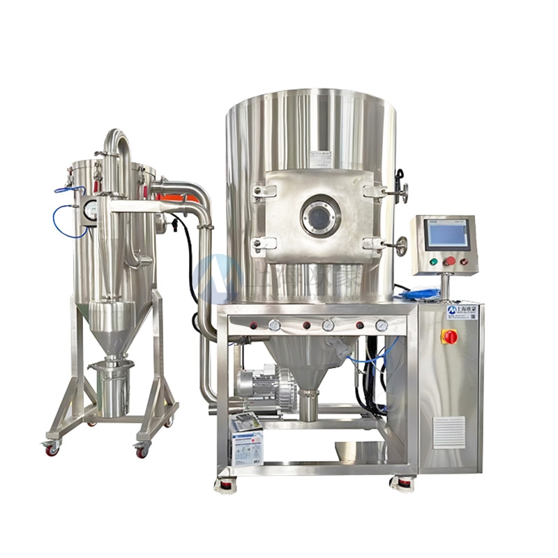 噴霧干燥機為開式循環,并流式,離心式霧化。干燥介質空氣經過初、中效空氣過濾器過濾后根據操作指令由鼓風機吸取再經加熱器加熱通過高效過濾器的熱風分配器進入噴霧干燥主塔。液體物料根據操作指令經過蠕動泵,進入高速旋轉的離心噴頭,在離心力作用下被分散成小霧滴。在噴霧干燥主塔內,小霧滴與熱風在充分接觸,沿其特定路徑進行熱交換后被干燥成為產品,然后通過旋風分離器實現分離,固體物料被收集,氣體介質再經過過濾后被排出。整套噴霧系統易清潔、無死角,符合GMP要求。