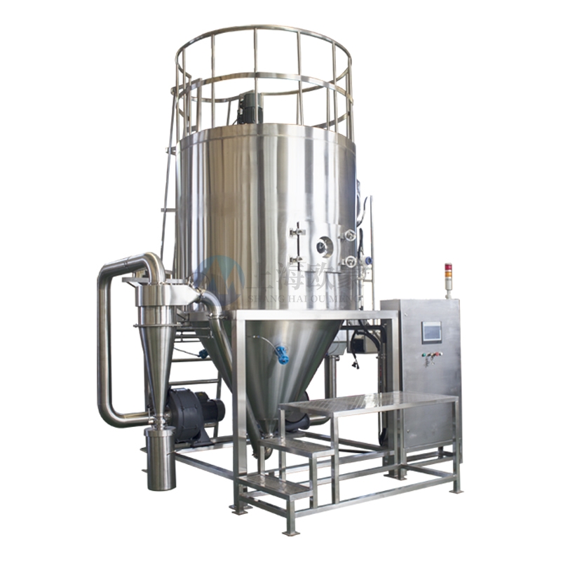 高速離心噴霧干燥機 | 高效噴霧干燥設備 | 工業級快速干燥解決方案:干燥機為開式循環,并流式,離心式霧化。干燥介質空氣經過初、中效空氣過濾器過濾后根據操作指令由鼓風機吸取再經加熱器加熱通過高效過濾器的熱風分配器進入噴霧干燥主塔。液體物料根據操作指令經過蠕動泵,進入高速旋轉的離心噴頭,在離心力作用下被分散成小霧滴。在噴霧干燥主塔內,小霧滴與熱風在充分接觸,沿其特定路徑進行熱交換后被干燥成為產品,然后通過旋風分離器實現分離,固體物料被收集,氣體介質再經過過濾后被排出。整套噴霧系統易清潔、無死角,符合GMP要求。